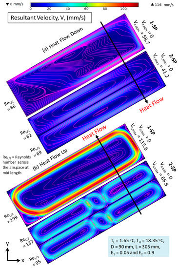 For the given operating conditions and dimensions of airspace of various orientations in the absence of convection, the rates of heat transfer by both radiation and conduction must be same for both scenarios of up and down heat flow (see [27] for more details). However, the convection contribution is greatly dependent on both the airspace orientation and heat flow direction. In previous studies [21,22,23,24,25,26], the magnitude of air velocity as well as the number of convective cells (N) per unit airspace length, NL (NL = N/L), were shown to have interactive impacts on airspace R-values with 1-SP or 2-SP.