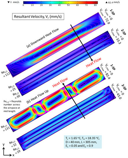 Resultant velocity distributions and velocity streamlines in 30° airspace of 40 mm thick for 1-SP and 2-SP subjected to heat flow: (a) down and (b) up.