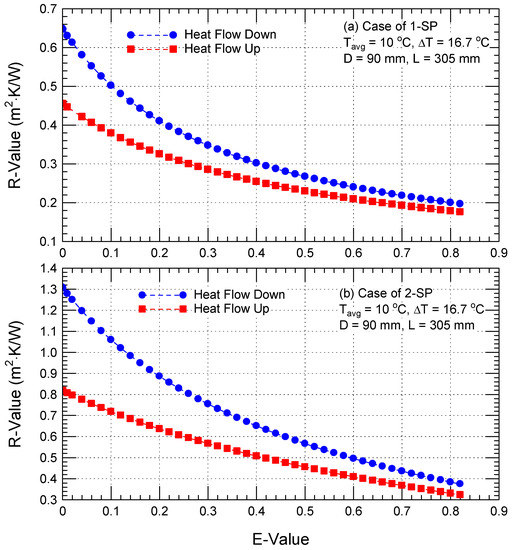 As shown in this figure, at small E values (E < 0.4), the R-value for downward heat flow was much greater than that for upward heat flow. At large E values (E > 0.4), however, the R-values for downward heat flow was slightly greater than that for upward heat flow. For example, for the case of downward heat flow at a low E value of 0.03, the R-values for 1-SP and 2- SP were 0.60 and 1.22 m2·K/W, respectively, compared to 0.43 and 0.79 m2·K/W for the case of upward heat flow.