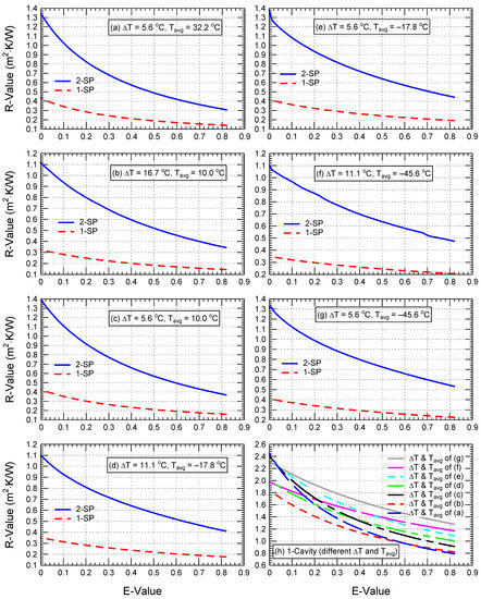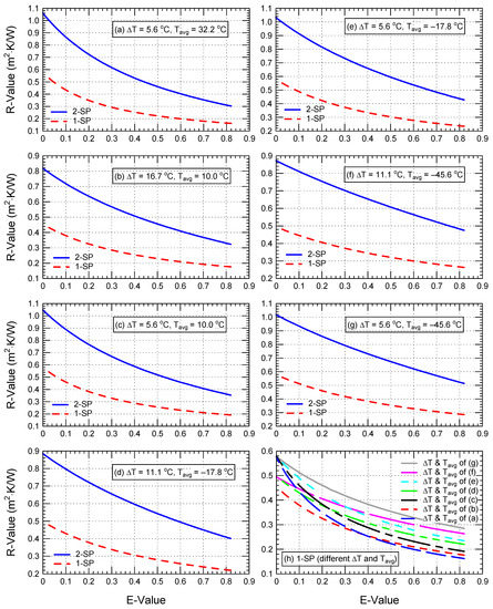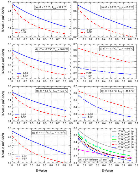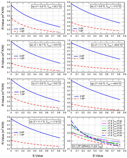 This table shows that, for moderate airspace thicknesses (D = 20 and 40 mm), the increase in the R-value between 2-SP case and 1-SP case was larger than for small and large thicknesses (D = 13 and 90 mm). The ranges of the increase in R-value at E = 0.03 varied depending on the values of the operating conditions (ΔT and Tavg), which are 12–116% (D = 13 mm), 69–206% (D = 20 mm), 203–239% (D = 40 mm), and 79–93% (D = 90 mm).