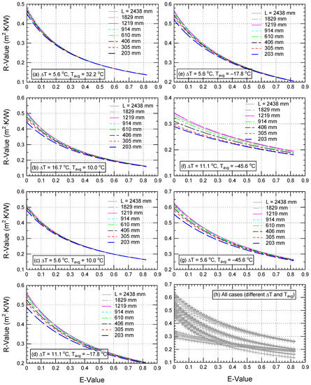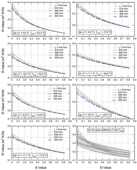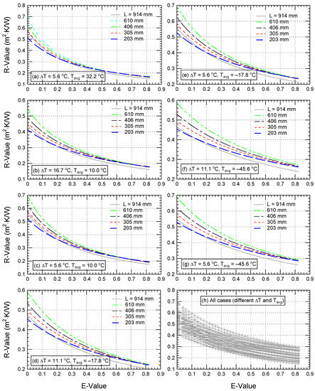 Consequently, the effective emittance, E (see the E expression provided in Figure 1) ranged between 0 and 0.82. The E value of 0.82 denotes the scenario when all airspace surfaces have emissivity of 0.9 (i.e., no low-e material/coating exists in airspace), while E = 0.0 denotes the scenario of entirely reflecting surfaces (i.e., no heat transfer by radiation takes place in the airspace). For the full E range (0.0–0.82), the simulations were performed for the same parameters used in ASHRAE for D, ΔT, and Tavg [20].