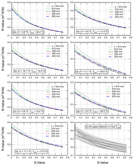 Close examination of the correlation provided by Equation (1) reveals that the first term on the RHS represents the R-value due to conductive heat transfer only, the second term provides the reduction in R-value due to convective heat transfer, and the last two terms represent the reduction in R-value due to radiative heat transfer at various effective emittance values (E). For different airspace thicknesses, the R-values in Figure 11, Figure 12, Figure 13 and Figure 14 are compared with those determined using the developed correlation.