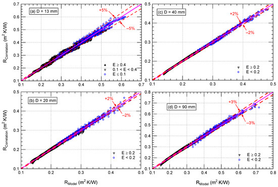These comparisons are shown in Figure 15a (D = 13 mm), Figure 15b (D = 20 mm), Figure 15c (D = 40 mm), and Figure 15d (D = 90 mm). Figure 15 shows that the obtained R-values using the correlation given by Equation (1) agree well with R-values provided in Figure 11, Figure 12, Figure 13 and Figure 14; agreement was achieved within ±5% for D = 13 mm, ±2% for D = 20 mm, ±2% for D = 40 mm, and ±3% for D = 90 mm.