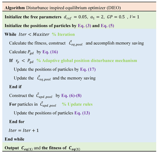 While standard EO has the advantages of fewer parameters and higher optimization efficiency compared to traditional meta-heuristic algorithms, it still has the shortcomings of stagnation in local optima and low accuracy during practical application. Therefore, the proposed intelligent inversion method is based on the newly developed meta-heuristic named the disturbance-inspired equilibrium optimizer (DIEO). In this section, the framework and performance of DIEO will be reported.