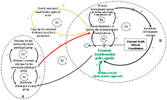 Interlinkages and causation pathways impacting current limitations faced by historically underprivileged food producers. (A) A ‘Success to the successful’ archetype that explains South Africa’s previous segregated socio-economic situation. (B): A ‘Shifting the burden archetype’, whereby an over-emphasis on sectoral development with the insufficient implementation of whole-systems evidence-based approaches results in incoherent development outcomes that eventually undermine the achievement of the economic transformation. Red arrow: An anomaly that persists for more than two decades among the previously marginalized despite the end of apartheid rule. Ideally, the current limitations of the historically underprivileged should have decreased, given the inclusive and/or affirmative opportunities offered through the new Constitution. This means that development solutions that are being brought about are not tackling the root causes of problems, resulting in inadequate outcomes, e.g., the small-holder agri-food sector remains poorly structured with insufficient capacity for a thriving local production (Loop R1 with yellow arrows: The vicious reinforcing consequence that perpetuate limitation in the smallholder food sector). Arrows with a double dash: Intrinsic systemic delays characteristics of complex systems; hourglass symbol: Dynamic nature of the variable represented as a rate of change, herein indicating that the economic transformation ought to be an on-going adaptive process, driven by the democratic Constitution that acts as a guiding principle for a new normal in South African politics to influence governance and steer other multi-dimensional change.