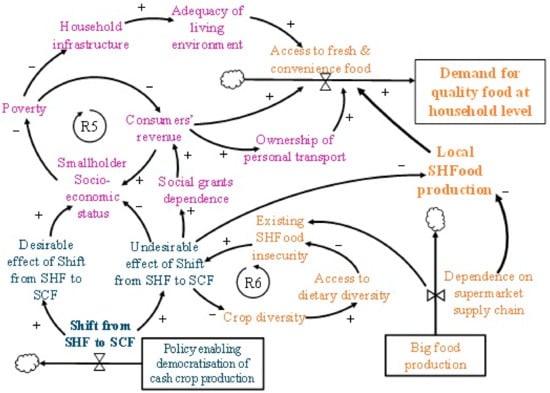 The second effect is when the farmers, despite aspiring to farm successfully, still find their socio-economic and household food security status undermined. This occurs due to a combination of factors [57,58] such as a poor business framework and insufficient input support, know-how, and infrastructure, hence contributing to an undesirable effect on the shift from SHF to SCF. The example of cash crop production, such as sugarcane in the KwaZulu Natal Province, was used to illustrate the unintended consequence in the reinforcing vicious loop, R6. In striving to produce sugarcane as a monocrop, on-farm crop diversity is reduced because food crops are neglected. Dietary diversity within such households, which depends on subsistence farming, is undermined, leading to household food and nutrition insecurity. These consumers must increasingly rely on the ‘Big Food Industry’. Such a type of food sourcing from supermarket outlets creates a dependence on supermarket supply chains, which is unaffordable and inaccessible to poor communities, further exacerbating existing household food insecurity.