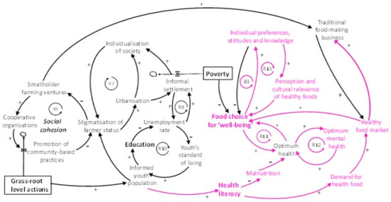 Socioeconomic factors that impact small-holder farming ventures and ‘Food choice for wellbeing’. Blue variables: Spill-over effect of de-agrarization through stigmatization leading to the proliferation of informal settlement and unemployment. Pink variables: Influence of ‘health literacy’ in leveraging food aspirations and ‘food choice for well-being’. Stimulating smallholder farming ventures and driving the demand for a healthy food market ought to stimulate traditional food-making businesses, which could then influence positive feedback upon food aspirations and choice. ‘Traditional food making business’ emerged as a currency to stimulate both smallholder farming ventures and to create a drive for the healthy food market and eventually ‘Food choice for well-being’.
