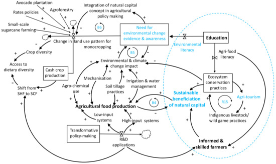 The emergence of functional education as a key nexus to improve environmental awareness and promote agri-food literacy. Agricultural food production in South Africa is essentially a dual system consisting of the low-input subsistence system and the high-input commercial systems that are stimulated through ongoing R&D policies. Agricultural operations (mechanization, irrigation and water management, soil tillage practices) and input (agrichemical use) applied to boost food production worsen climate change and environmental impacts and have a dampening effect on the sustainable beneficiation of natural capital (Balancing Loop B4). Emphasis on multi-faceted literacy ought to incentivize social entrepreneurial innovation and sustainable beneficiation of natural capital from agricultural activities (Loop R15: Virtuous reinforcing loop where the variables mutually reinforce agritourism, indigenous practices, and promote ecosystem conservation practices; all stimulated through functional agri-literacy). Loop B5: Evidence-building and awareness can reduce the impact of agricultural activities. Loop B6: On-going evidence-building and creation of awareness regarding environmental change ought to influence multi-sectoral policymaking, for instance by framing natural capital as transformational.