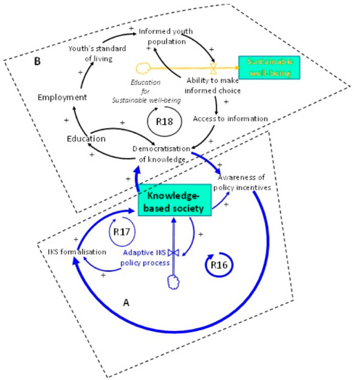 Interventions capable of driving sustainable well-being from the education perspective. (A) Reinforcing loop, R16, on the consolidation of knowledge-based society by inclusion of Indigenous Knowledge System (IKS) formalization, mediated by the democratization of knowledge and awareness of policy incentives. Loop R17: An adaptive IKS policy process reinforces the inclusion of indigenous cultural capital and knowledge; (B) tackling unintended effects of social exclusion of youth by using education as a mechanism to enable and drive responsible individual choice for sustainable well-being.