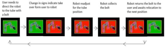 - Gwilt, I.; Rolph, J.; Eimontaite, I.; Cameron, D.; Aitken, J.; Mokaram, S.; Law, J. Cobotics: Developing a Visual Language for Human-Robotic Collaborations. In Proceedings of the Cumulus Conference Proceedings Paris 2018—To get there: Designing Together, Paris, France, 11–14 April 2018. [Google Scholar]