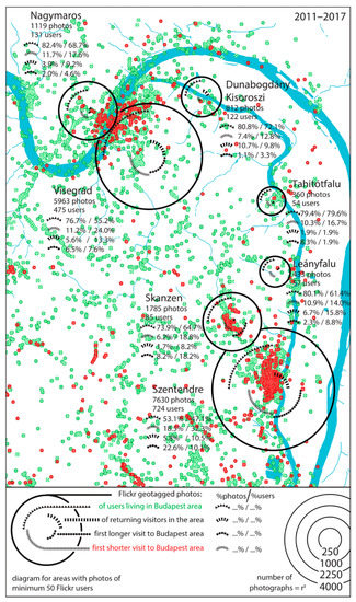Analyzing all photos from the Budapest Metropolitan Area and using this database to narrow down the geographical territory to the towns of the Danube Bend made it possible to determinate the role of this region inside the tourism system of Budapest and also in relation to the residents of the larger region itself. Only 13.6% of the 19,284 users uploading geotagged photography in the area of the Budapest Metropolitan Area were locals; the rest of the users were in one of the groups of tourists (Table 1). The largest group was the first-time short trip visitors, with 57.9% of all users being in this category, and most of these are international tourists, according to official statistics [33].