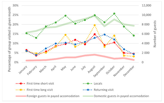 It is possible to compare the number of users with the official statistics of tourists in paid forms of accommodation in this region. The distribution along seasons correlates well in the case of domestic tourists. However, foreigners stay much less often in hotels here than domestic visitors, as most of these foreign visitors come to Budapest, stay there, and visit the Danube Bend only for a day trip.