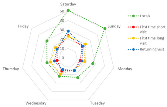 It is possible to examine the temporal distribution of these groups of photographers in the Danube Bend area, both for the different months of the year (Figure 2) and the different days of the week (Figure 3). The figures display the percentage of total users of the groups taking photos in the given time periods. Although the general trend is that fewer users took photos during the winter months, locals and visitors from Budapest also visited the region in this season. For most of the groups, the months of May, August, and October were the most popular. The exception is the group of returning tourists, whose number constantly increases until September and then decreases until the February minimum. First-time visitors (also those on longer trips) follow similar patterns, and their sum of percentages through the 12 months is exactly 100%, showing how every first-time tourist visited the area just once. This is 108% for returning tourists, meaning that very few of these returning tourists also return to the Danube Bend. The sum is 239% for locals and visitors from Budapest, showing how users from this group took photos in two or three different seasons during their activity. This number is probably much higher for locals and stays around two for those from Budapest, but it is still safe to state that an average visitor from Budapest returned to the region at least twice during the past decade.