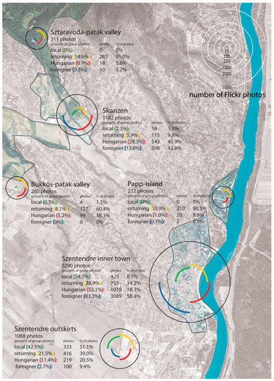 In Szentendre, five spatial clusters were identified, all of which had more than 200 photos taken (Figure 4). The most visited cluster was the historical city and its riverbank, where 5290 photos were taken, of which 8.1% were taken by locals, the majority of the photos of this user group (54.7%). Most of the photos in the center were taken by foreigners (58.4%), and 83.3% of their photographing activities were concentrated here. Moreover, 53.1% of the photos by first-time Hungarian visitors and 38.9% of the photos by returning Hungarian visitors were taken in the center, making this area the tourism center of Szentendre. The second most visited cluster was the area of Szentendre Skanzen with 1182 photos, 13.6% of which were taken by foreigners, 28.3% by Hungarian tourists, and only 5.9% by returning visitors. Szentendre has a holiday area on the Danube, the Papp Island campsite, where 90.5% of the photos were taken by returning Hungarian visitors. Returning visitors were also the majority taking part in Pilis Park Forest excursions. In the Sztaravoda creek valley, the proportion of their photos was 91%, and in the Bükkös creek valley, it was 60.4%. The few local users were understandably significant in numbers (31.1%) at the mostly residential and holiday home areas around the center of Szentendre, where 39% of photos belonged to returning Hungarian visitors who were on holiday in Szentendre’s holiday area or visiting the more out-of-town parts of the Danube (e.g., Postás beach). This detailed visitor analysis of Szentendre shows that foreign tourists mostly visited the historical city center only, with few of them reaching the Skanzen. Hungarian visitors had similar visit patterns, except for returning tourists, who visited Szentendre more regularly. They are hikers who followed the hiking trails of the Pilis Park Forest, holiday home owners who spent time in their weekend house in Szentendre, and returning visitors who were regularly on vacation on Papp Island or other sections of the Danube. All of the user groups spent at least a third of their time in the city center, so restaurants and services here were also used by weekend tourists not registered in the official statistics.