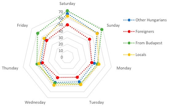 Temporal distribution of photographers in the Danube Bend region through the days of the week (% of users from the user groups who visited the area on the days of the week).