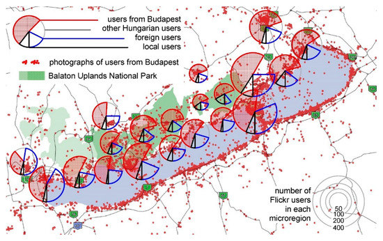 Some social media platforms partially manage their service on the geographical position of photography uploaded. The “geotags” of images uploaded to sites such as Flickr.com (https://flickr.com/, accessed on 8 February 2022) allow for a new kind of research on the spatial behavior of tourists [30,31,32]. On Flickr, there are more than 1,000,000 photographs uploaded with a geotag only from the area of Hungary. This quantity of specific spatio-temporal data enabled the research of unconventional tourism in the two most popular rural tourism regions in Hungary, where the majority of visits comprise weekend and one-day trips, and also the activities of holiday home owners.