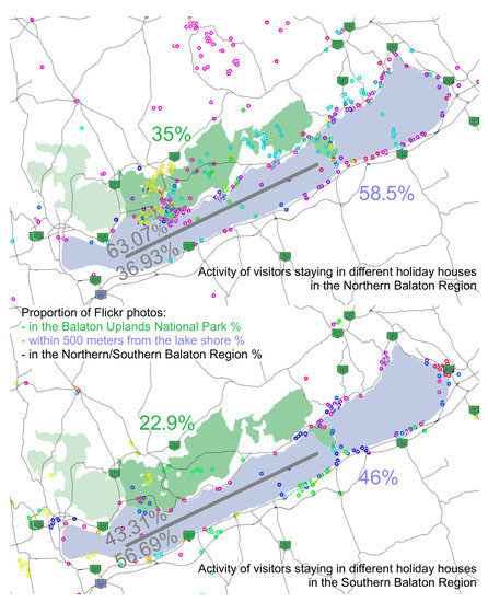 In the Balaton region, we also identified Flickr users staying in non-paying accommodation, typically holiday homes. This was achieved by separately analyzing the activity patterns of users who uploaded photos taken in at least two different time periods within a 50-m radius in a recreational area around Balaton—these are built-up areas where there are no residential buildings, only holiday homes. It was therefore necessary to qualitatively analyze all repeating photographs in such recreational areas: the content of these images typically depict a home environment, i.e., family, interior, private gardens, and related subjects. Only if such attributes were true users were assigned the ‘holiday home owner’ tag, and their activities outside their accommodation could be separately analyzed in both the northern and southern shore of Lake Balaton for comparison.