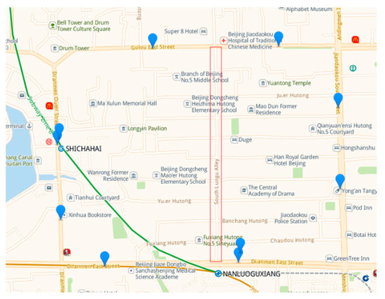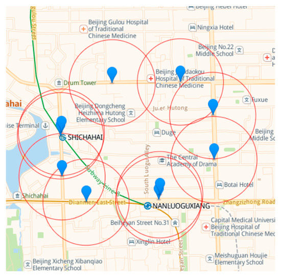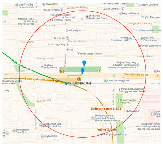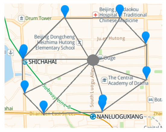 Figure 4 shows the geographical–location relationship between the South Luogu Lane scenic spot and the surrounding 10 bus and subway stations. The red dots indicate subway stations, and the blue dots indicate bus stations. The South Luogu Lane scenic spot is a road in the middle (the red area above). It is obvious that the relationship between the stations and the scenic spot constitutes a ‘graph’ structure. There are 11 nodes in the ‘graph’, which are composed of bus, subway stations, and the South Luogu Lane scenic spot. Moreover, there are different areas around the station. According to the analysis of crowd behavior, these areas may affect the passenger flow at the station. As shown in Figure 5, if passengers disembark at the South Luogu Lane bus stop, they may also go to the Weaving and Dyeing Bureau Primary School, Beijing Hospital of Traditional Chinese Medicine, or the Central Academy of Drama, etc.