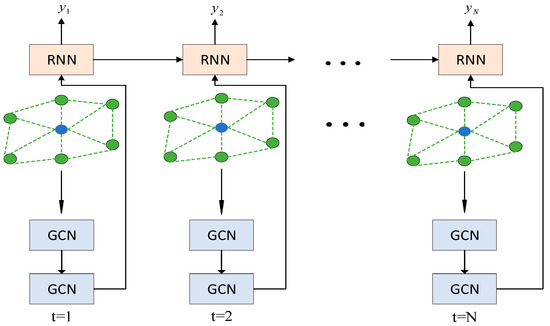 The spatial location information and time dimension information are equally important in the passenger flow prediction of the South Luogu Lane scenic spot. Therefore, we propose a GCN–RNN scenic spot passenger flow prediction model, which extracts spatial location information by GCN and temporal dimension information by RNN. The GCN–RNN model consists of a two-layer graph convolutional network and a layer of recurrent neural network. The model architecture is shown in Figure 3.