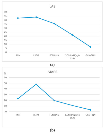 In addition, we replace the GCN in the model of this paper with FCN to compare the performance. FCN–RNN refers to a model that uses a fully connected network instead of a graph convolutional neural network. The mean squared error of FCN–RNN is 19.47%. It can be seen that the error obtained by replacing the GCN model is larger, so it is verified that the graph convolutional network is better for extracting spatial features. To demonstrate the effectiveness of surrounding area features, we retrain the GCN–RNN model without characteristics of the surrounding area (w/o CSA), and the mean squared error is 10.94%. It is evident that the model without CSA performs poorly.