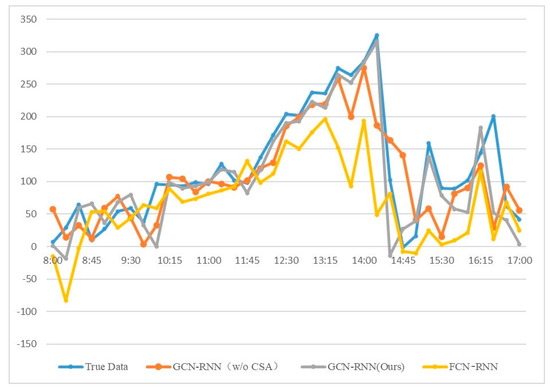 Compared with the FCN–RNN model, the trend of GCN–RNN prediction curve is consistent in most time periods, such as 12:30–13:00, 13:15–14:00, 16:15–16:45, and so on. However, the FCN–RNN model is quite different from the GCN–RNN model, indicating that the FCN model has a weaker ability in spatial feature extraction. Compared with the GCN–RNN (excluding CSA) model, the GCN–RNN (excluding CSA) model also has some deviation from the GCN–RNN model, but the deviation is smaller than the FCN–RNN model. It is proved that CSA, as auxiliary information, plays an active role in the prediction.