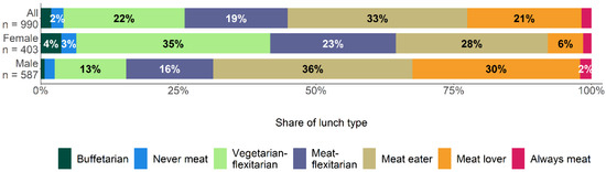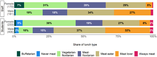 Lunch types differ in relation to university affiliation (i.e., staff or student) and gender (Figure 2): male staff exhibit meat-oriented lunch habits almost twice as often as female staff (M: 61.9% vs. F: 34.1%). Similarly, male students are almost twice as likely to show meat-oriented lunch habits than female students (M: 71.1% vs. F: 36.5%). Flexitarian lunch habits show a corresponding pattern: 59.9% of female staff and 56.8% of female students show ‘Vegetarian-flexitarian’ or ‘Meat-flexitarian’ habits compared to 40.1% of male staff and 43.2% of male students. It is noteworthy that among female staff, the rare lunch habit ‘Buffetarian’ is much more frequent than in any other group.