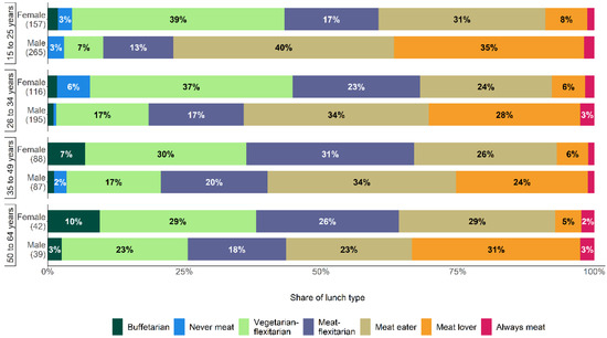 The association between lunch type, university affiliation and gender reflects the connection between age and university affiliation. Overall, the meat-oriented lunch types consist of 73.8% men and 26.2% women. While the percentage of meat-oriented lunch types for women varies little by age, for men the percentage decreases with increasing age (Figure 3). As a consequence, the difference between the genders narrows with age. The difference between women and men is greatest in the youngest age group: the youngest men (77.0%) are approximately twice as likely to show meat-oriented lunchtime eating habits than the youngest women (39.5%). The percentage of ‘Buffetarian’ increases as people get older, with the difference between women and men remaining.