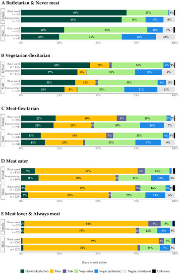 Males and females of the type ‘Meat-flexitarian’ (n = 185) differ minimally: women and men reduced the proportion of meat dishes from 40% (F) and 43% (M) to 25% (F: −38.4%: M: −41.5%) (Figure 4C). This decrease in the percentage of meat dishes occurred primarily in favour of vegan dishes and applies to both women and men. The share of ‘Hot & Cold’ buffet options selected, on the other hand, hardly changed.