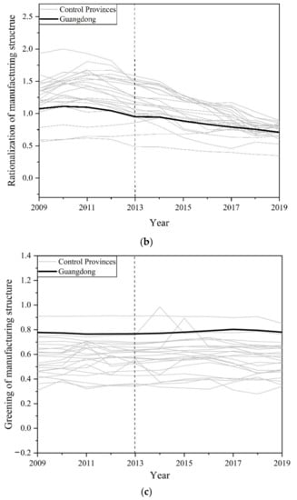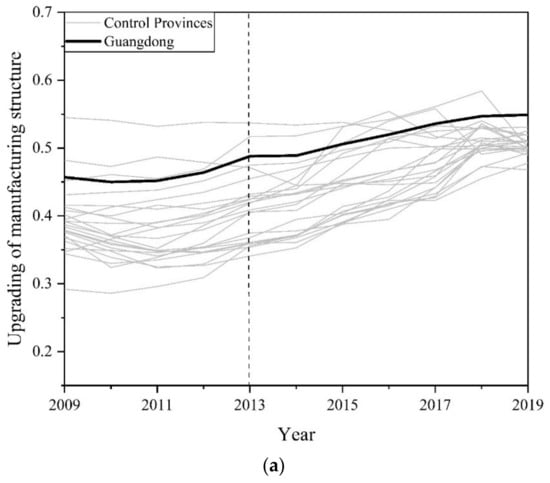 However, it was not easy to find a control unit similar to Guangdong Province but not affected by policies. Figure 1 shows the upgrading, rationalization, and greening manufacturing structure of Guangdong and 23 other provinces, which clearly shows that the manufacturing structure of Guangdong is significantly different from the average level of other provinces. We formally tested the differences between Guangdong and other provinces using the DID method. Using the data for 24 provinces for 2009–2019, we regressed , , and on provincial dummies, year dummies, and the interactions of Guangdong and year dummies. The results show that, before 2014, almost all coefficients were significantly negative, indicating that the , , and between Guangdong and other provinces changed significantly more in these years than in 2013. In addition, any pair of coefficients for adjacent years prior to 2014 was significantly different, which indicates a different manufacturing structure between Guangdong and the rest of China. Therefore, if we implement the DID analysis directly, the estimated impact of carbon trading policies may be biased. Furthermore, Cameron and Miller (2015) pointed out that a DID model is likely to be inconsistent if there are too few treatment groups compared with control groups, which was the case in our study.