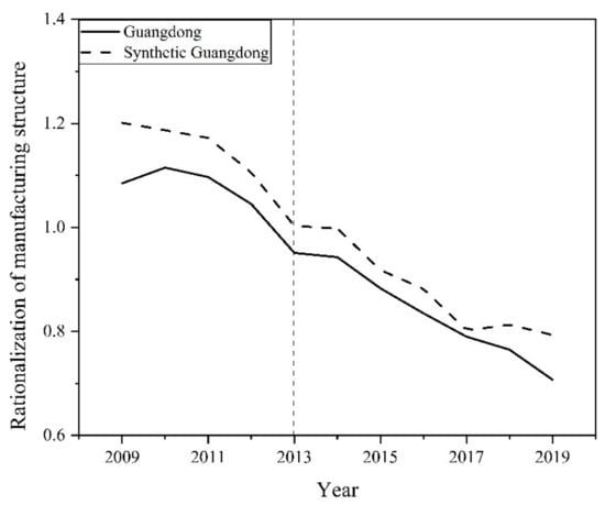 Figure 2 shows the test results of the rationalization effect of manufacturing structure in Guangdong and synthetic Guangdong. The solid line represents Guangdong, and the dashed line represents synthetic Guangdong. Whether observing the results before or after implementing the carbon emissions trading policy, there was no significant change in Guangdong’s manufacturing structure rationalization indexes and synthetic Guangdong. This indicates that the implementation of the carbon emissions trading policy has not had a significant effect on the manufacturing structure rationalization of Guangdong for the time being.