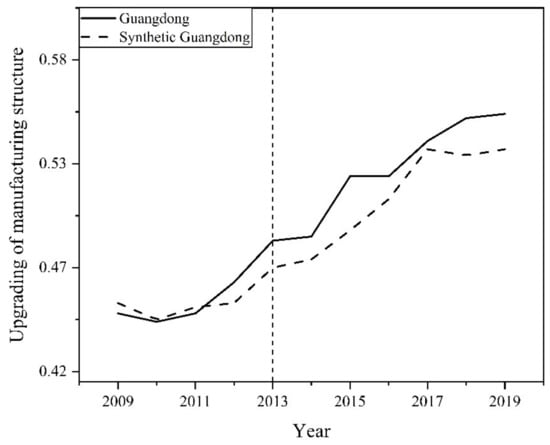 Figure 3 shows the test results of the upgrading effect of the manufacturing structure of Guangdong and synthetic Guangdong. The solid line represents Guangdong, and the dashed line represents synthetic Guangdong. Before and after 2013, Guangdong and synthetic Guangdong Province were relatively similar and close to each other, but after implementing the policy, there was a significant difference between them. The upgrading index of the manufacturing structure of Guangdong was on an upward trend. It was significantly higher than the upgrading index of manufacturing structure of the synthetic Guangdong during the examined time. This indicates a continuously optimized trend in the manufacturing structure of Guangdong, and the implementation of carbon emissions trading has accelerated the process of manufacturing structure advanced in Guangdong.