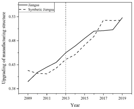 Due to the conclusion that the implementation of carbon emissions trading policy has a significant contribution to the upgrading manufacturing structure in Guangdong, we chose Jiangsu as an example, which had a significant positive contribution to the upgrade effect of the manufacturing structure in Guangdong. The most positive contributions to the upgrade effect of the manufacturing structure in Jiangsu were Zhejiang (0.56), Inner Mongolia (0.283), Shandong (0.094), and Liaoning (0.063). As shown in Figure 5, the indicators of the upgrade effect of the manufacturing structure in Jiangsu and synthetic Jiangsu did not show regular changes before or after implementing the carbon emissions trading policy. The indicator of upgrading the manufacturing structure in Jiangsu was not always higher than that in synthetic Jiangsu. It indicates that the results of the empirical tests in the previous subsection are not coincidental, i.e., they are valid. Implementing a carbon emissions trading policy can effectively upgrade the manufacturing structure of Guangdong.