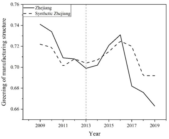 Due to the conclusion that the implementation of carbon emissions trading policy has a more significant contribution to the greening of manufacturing structure in Guangdong, we chose Zhejiang as an example, which had a significant positive contribution to the greening effect of manufacturing structure in Guangdong. Positive contributions to the optimization of manufacturing structure in Zhejiang were found for Shandong (0.456), Guangdong (0.365), and Jiangsu (0.179). Figure 6 shows the fitted paths of Zhejiang and synthetic Zhejiang regarding the greening indicators in the manufacturing structure. The greening effect indicators of manufacturing structure did not show regular changes before or after implementing carbon emissions trading policy. Although the greening indicators of manufacturing structure in Zhejiang changed after 2016, the difference in change was smaller than that seen for Guangdong, so it can prove that the empirical test results in the previous subsection are valid. Carbon emissions trading does promote the greening of the manufacturing structure in Guangdong.