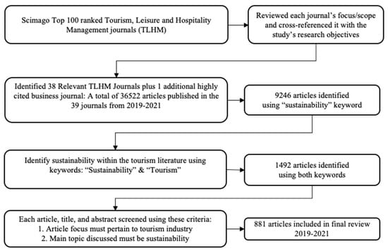 The SCImago journal ranking system is publicly available information that includes the journal’s title and scientific indicators about that system developed from the information contained in the Scopus database. These indicators can be used to assess and analyze scientific domains, such as tourism. The academic community recognizes the SCImago journal rankings because of its ability to provide comprehensive coverage of available resources. The top 100 SCImago-ranked tourism, leisure, and hospitality management journals were initially considered for this study [25]. Three researchers independently reviewed these 100 journals in this category for consideration and inclusion in this study. The journals were selected by cross-referencing each journal’s focus and scope with their respective relevance to this study’s research objective of reviewing current sustainability research in the tourism industry. The three lists were compared, and any differences were discussed and reconciled until consensus was achieved about which journals to include in this study.