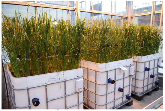The air temperature and the additional light intensity of the greenhouse chambers were automatically regulated. The air temperature was increased from the initial 10–12 °C to 24–26 °C over 16 weeks, while air humidity was maintained between 60% and 80% and was regulated by ventilating the greenhouse chambers’ air [31]. Whenever it was necessary, the natural-light intensity was enhanced by artificial illumination to 500 μmol m−2 s−1 at the beginning of the vegetation period, which was gradually increased to 700 μmol m−2 s−1. Thiovit Jet fungicide (Syngenta AG, Basel, Switzerland) (active ingredient: sulfur) and Karate 2.5 WG insecticide (Syngenta AG, Basel, Switzerland) (active ingredient: lambda-cyhalothrin) were applied two times (BBCH 23 and 37) [32] following the distributor’s recommendations by the dosage against powdery mildew and aphids, respectively. The atmospheric CO2 concentration in the control (ambient) chamber was maintained at ~400 ppm and the gas concentration was enhanced to 750 ppm in the other chamber by using a network of perforated pipes placed at a height of 0.5 m above the plants. The uniform distribution was achieved through ventilation.