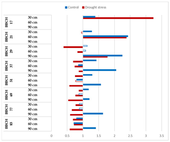 The CO2 reactions of Mv Karizma showed variability during vegetation, and this parameter was influenced significantly by the watering (Figure 6). Roots can be observed only at 30 cm at the BBCH 17 stage, and significant positive CO2 responses were observed in terms of the root development under drought-stressed conditions, while the opposite tendency was observed under optimum irrigation. The negative impacts of the CO2 enrichment were detected at 30 cm under optimum irrigation in the BBCH 21 stage, but significant positive responses to both watering levels were observed at 60 cm. The reactions of Mv Karizma to CO2 enrichment was consequently negative at 30 cm, and this trend was not influenced by the intensity of watering, while the CO2 reactions were tendentially negative between the BBCH29 and BBCH 83 stages under drought-stressed conditions and positive at 60 cm under controlled irrigation. Negative CO2 reactions were determined at 90 cm at both watering levels, but this tendency was significant at first when plants reached the BBCH 51 stage (Figure 6).