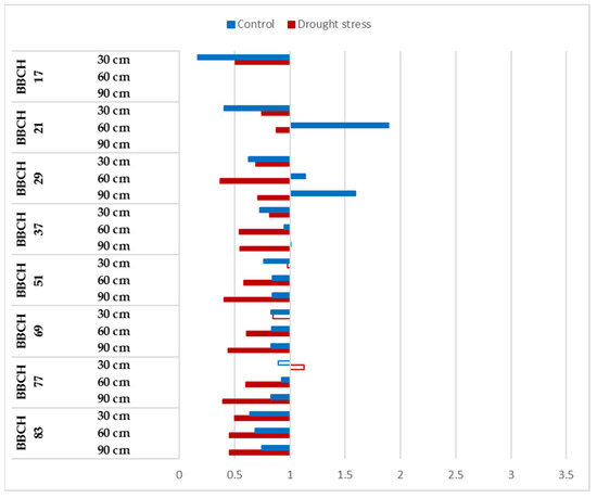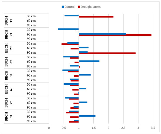 The responses of Mv Pálma to the elevated CO2 showed a variability during the vegetation period and significant alterations were determined between the well-watered and drought-stressed treatments (Figure 4). The CO2 response was positive and significant from the sowing until the BBCH 21 stage at 30 and 60 cm, and this tendency can be observed for 90 cm at the BBCH 29 stage. Generally, the CO2 enrichment induced faster root development in Mv Pálma.