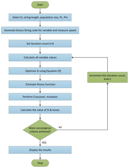 GA is used to find the best location of DG in the IEEE 33 bus system. It involves reproduction, crossover, and mutation. Its procedure can be illustrated by the flowchart as shown in Figure 3. The process begins with selection of a binary string as shown by Equation (24), the parameters for which are assumed as follows: