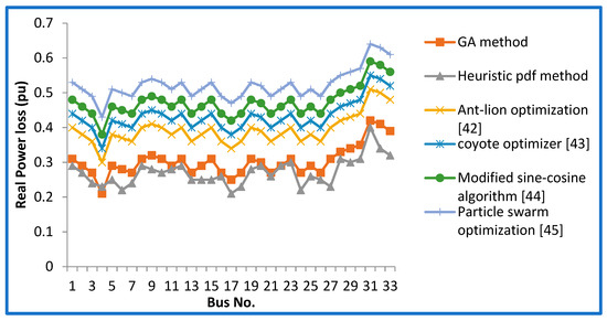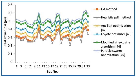 Figure 4 and Figure 5 show real power loss at bus 17 for CPLF and CILF using GA. The performance parameter for finding the DG location can be analyzed from Table 2 and Table 3 at different DG locations in the IEEE 33 bus system using heuristic PDF and GA methods for both CPLF and CILF. Figure 6 and Figure 7 provide the performance parameter comparison of GA with the heuristic method at different buses for CPLF and CILF. Moreover, in order to have comprehensive analysis and comparison for the DG location with GA and heuristic pdf, the results are compared with those obtained with the ant-lion optimization algorithm [42], coyote optimizer [43], modified sine-cosine algorithm [44], and particle swarm optimization [45]. The performance parameter evaluation for the estimation of DG location by using the ant-lion optimization algorithm [42], coyote optimizer [43], modified sine-cosine algorithm [44], and particle swarm optimization [45] is shown in Table 4, Table 5, Table 6 and Table 7 for CPLF and CILF type of load.