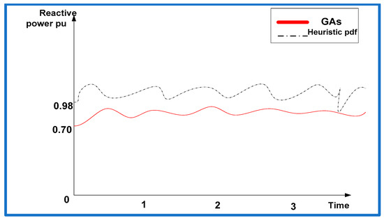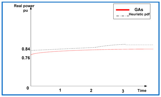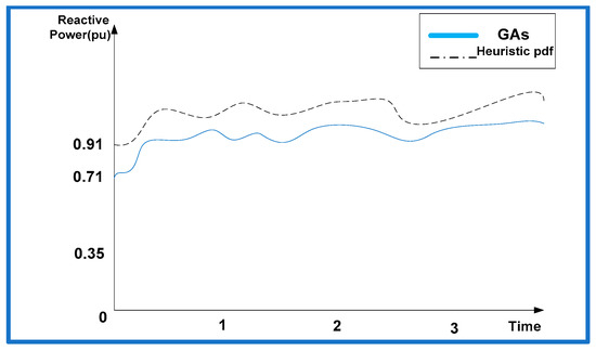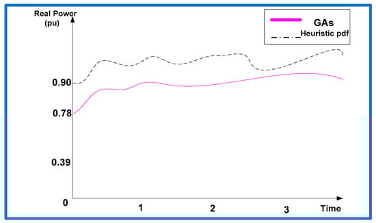 After deciding the optimal location of three DGs, it is also required to check the DG size to confirm its placement at bus 17. DG size is estimated from Table 9, Table 10 and Table 11 by using heuristic pdf, GA, ant-lion optimization algorithm [42], coyote optimizer [43], modified sine-cosine algorithm [44], and particle swarm optimization [45] for both CPLF and CILF type of load. It is observed that the size of DG when placed at bus 17 is found to be the minimum. The relative comparison of DG size for bus 17, 4, and 3 is shown in Table 12. The minimal size of DG is obtained under GA as compared to the heuristic method. Figure 8, Figure 9 and Figure 10 illustrate the real power and Figure 11 illustrates the reactive power at bus 17 for both CPLF and CILF. From the results, it is confirmed that bus 17 is the best choice for the location and optimum sizing of DG is also obtained here. Subsequently, bus 3 and bus 4 have the appropriate size of DGs, which assures the confirmation of the DG location. The location and size of three DGs at the allotted location in the IEEE 33 bus system are shown in Figure 12.