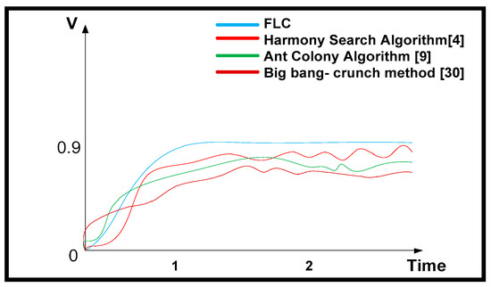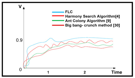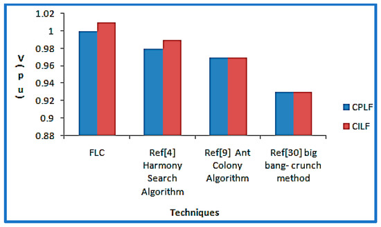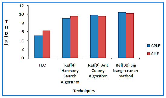 Now, a suitable location for D-STATCOM at a particular bus has to be decided. From Figure 9 and Figure 10, it can be inferred that voltage profile and THD (%) of the real power at bus 10 are found to be worst with existing methods such as harmony search algorithm [4], ant colony algorithm [9], and big-bang–crunch method [30] for both CPLF and CILF. Therefore, D-STATCOM is placed at bus 10. Figure 17 and Figure 18 show the voltage (pu) comparisons at bus 10 for CPLF and CILF. It is also observed that switching of D-STATCOM with FLC improves its voltage profile and THD (%). This means that switching of D-STATCOM with FLC helps to improve the performance parameters in comparison to existing methods. The comparison of voltage profile and THD (%) of real power at bus 10 with existing techniques and D-STATCOM-based FLC is shown in Table 17 and Table 18 and its graphical comparison is shown in Figure 19 and Figure 20.