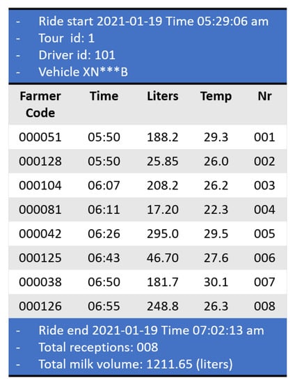 The Fontina PDO supply chain already has a system to trace the milk produced by each farmer. The system is employed in the milk production phase. During this phase, the transporter checks the milk conferred by farmers and inserts the quantity (in liters) into the system. Figure 3, shows the receipt that the system produces when the transporter delivers the total volume of milk collected in mountain pastures to dairies. The systems employed already detect important information for traceability: Farmer code for the identification of farmers, Time and Date when the milk is collected, the number of Liters conferred by each farmer, its Temperature, and the total Count of delivers.