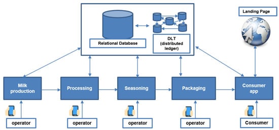 In the dairy supply chain, Regattieri et al. [] have proposed a platform to support the traceability of the famous Italian cheese “Parmigiano Reggiano” from the farm to the final consumer. The framework supports identifying the product’s characteristics in various aspects along the value chain: cattle breeding, dairy, seasoning, and packaging warehouse. The developed system is based on a central database that collects data at all identified stages in the food chain. Some information is collected automatically using sensors and barcodes, while other information is collected manually.