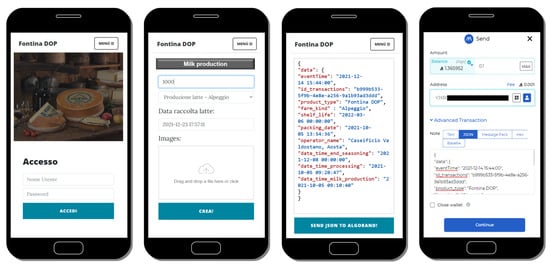 Figure 6 shows some screenshots of the developed traceability platform. In particular, the first two screenshots show the interfaces (in Italian) for login in the application and the information to be registered in the milk production phase. While the third and fourth screenshots show the querying data when the packaging phase is complete and the Algorand wallet [] connected to the traceability platform. In particular, the data is encapsulated in JSON format to be sent to Algorand Blockchain as advanced transactions. Each operator has its own wallet on Algorand, and the JSON generated is sent to a node in a Blockchain to guarantee the immutability of the data registered.