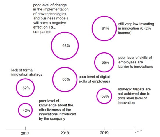 In 2018, Blockchain was considered a breakthrough innovation in the T&L sector. The following places were taken by Artificial Intelligence, robotics, independent vehicles and drones. All these innovations are highly correlated directly with technological development. It was the technological transformation that was considered to be the biggest challenge for the T&L sector, taking first place before other factors: meeting the growing demands of clients, implementing innovations, regulations and competition. The biggest threat from the point of view of a single company is a very competitive and dynamic market. In the context of innovation implementation, on the other hand, the reluctance to change, high risk associated with the possible unprofitability of investments, limited financial resources and lack of creativity, ideas, determination and visionary leadership are considered significant barriers. These problems correlate with the declaration of holding an own implementation team, as in most companies there is no such a cell or specialized department (there is a very large discrepancy between companies familiar with technical innovations and those that do not have a lot of knowledge in this field, in the context of awareness regarding the need for continuous development and improvement; in the former, specialized cells for research and analysis of innovation implementation possibilities appear in half of the cases, and in the latter, a similar cell appears only in every fourth company) [34,35].