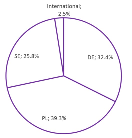 Statistical analysis focused on the T&L sector entities which implemented innovative solutions in their structures during the pandemic. Although companies from the three countries were addressed in the project, 3% of the total expressed the opinion that they are international organizations. The percentage of respondents from particular countries was 39% from Poland, 32% from Germany and 26% from Sweden, respectively (Figure 3).