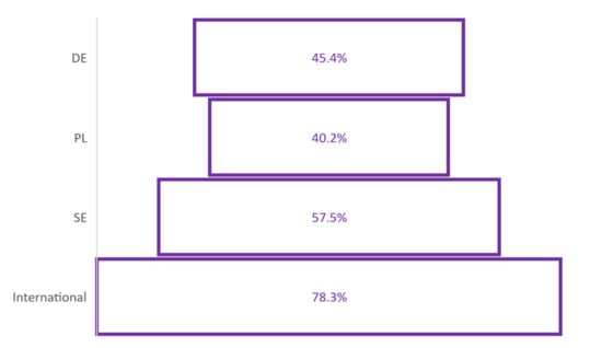 The results obtained are consistent with the research results and observations made by other researchers. Lack of appropriate knowledge and skills as well as lack of funds repeatedly appear as the main barriers to innovation development [43,47,48]. Another very important obstacle reported by companies was the development of coronavirus pandemic, which affected the economic life of the whole world. The COVID-19 represents a serious threat to innovation, which should be protected from its effects and additionally stimulated by government programs [49]. The opinions of companies located in different countries differ slightly. Those companies that operate in highly developed countries (Sweden second and Germany ninth in the world according to the Global Innovation Index (GII) in 2020 [14]) have less problems with financing innovation than entities in developing countries (such as Poland—38th in the world [14]). The values of GII index also correspond to the number of innovative economic organizations in different countries (Figure 5). The least modern solutions are adopted by the T&L sector in Poland—40.2%, a little more in Germany—45.4% and the most in Sweden—57.5% and by international companies 78.3%.