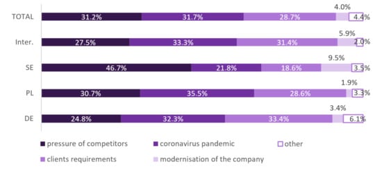 The most frequently indicated motivation for the decision to reach for innovations turned out to be the coronavirus pandemic—31.7% of responses (Figure 6). Almost as important was the competition pressure and customer requirements. Referring to the research results contained in the report “Supply chain innovation study” [40] a very large identity can be observed—according to the respondents, the most important factors that prompted them to modernize their companies were growing customer requirements and competitive environment. In this particular case, there appears also a significant statistical dependence in relation to the country in which the organization operates. The distribution is shown in Figure 6.