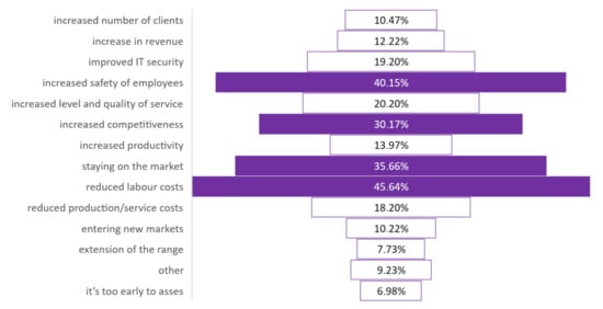 Enterprises recognize many benefits of R&D. Those who decided to choose it, mentioned most often as an advantage: reduced labor costs (45.64%), increased safety of employees (40.15%), staying on the market (35.66%) and increased competitiveness (30.17%). The list of perceived benefits has been presented in Figure 8.
