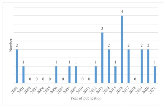 There was a total of 24 articles included in this review. Riva and his team were the most researched on this topic (10/24, 42%). To the best of our knowledge, there is no single review dedicated to using VR in the treatment of obesity. However, there are a few reviews that included this topic, such as [21], which included articles that were published up to 2013 and reported six studies on obesity. Since then, 18 (75%) of the articles in our selection have been published, thereby indicating an increase in interest in using VR for obese patients (Figure 2). All articles were in English and were published between 2000 and 2021. Most trials were conducted in Europe and the USA.